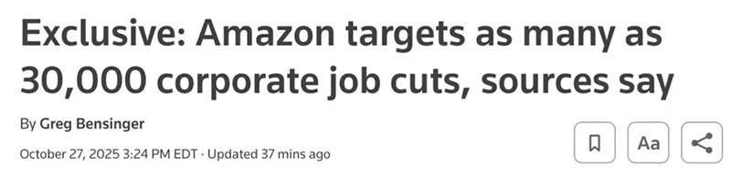 素材来源:https://www.reuters.com/business/world-at-work/amazon-targets-many-30000-corporate-job-cuts-sources-say-2025-10-27