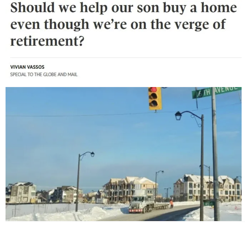 《环球邮报》近日刊登读者来信,询问:我们正处于退休边缘,但我们正在考虑,将帮助儿子买房作为退休计划的一部分。我们应该这样做吗?在这个过程中,我们应该考虑什么?