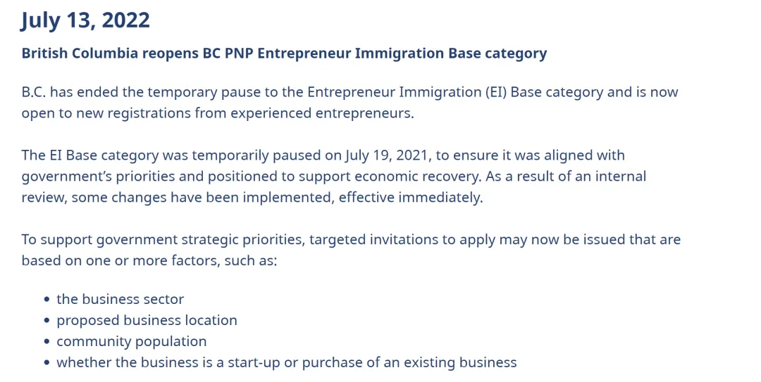 为了吸引更多企业家和高级管理人才,加拿大BC省政府曾在5月宣布,将于2022年7月份重新启动常规企业家移民项目((BCPNP Entrepreneur Immigration Base Category) 。2022年7月13日,暂停了一年的可以直接落户大温地区的常规企业家移民终于正式强势回归了!