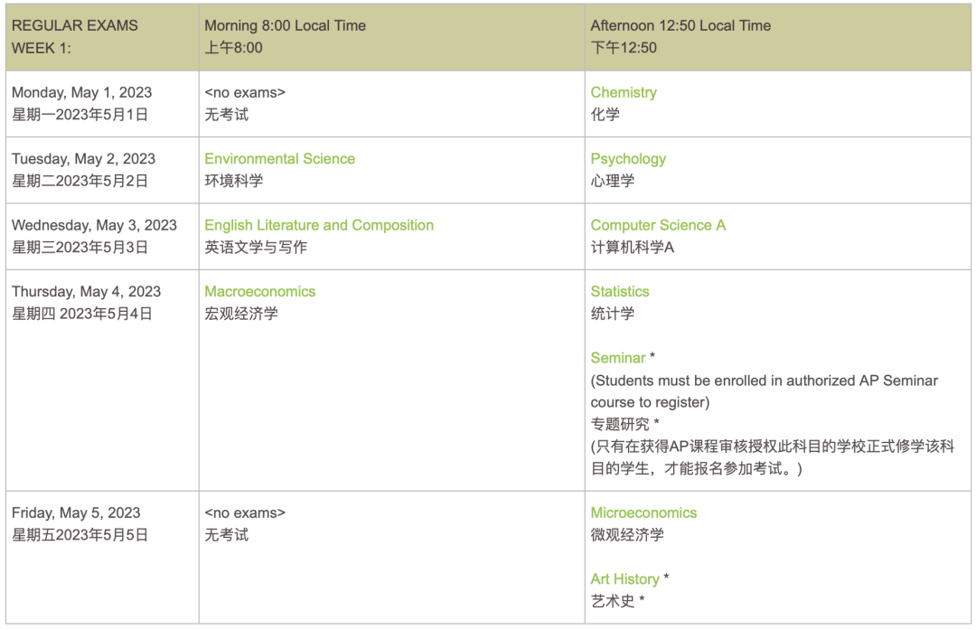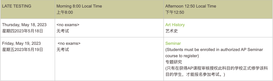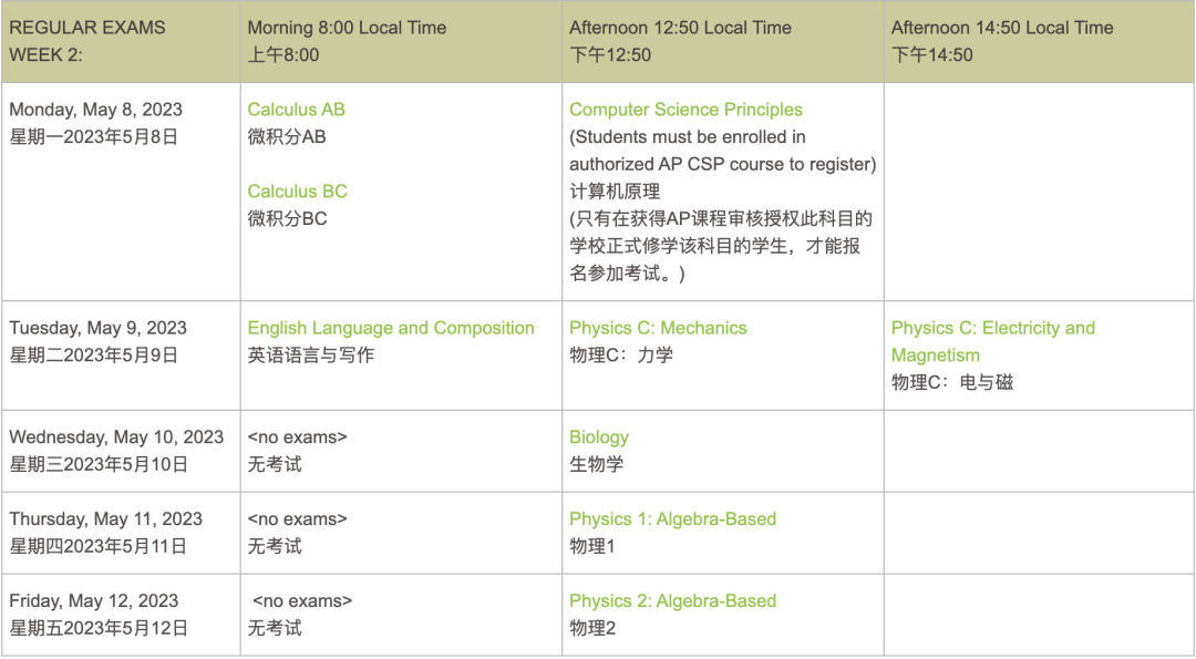 2023年AP考试将在5月1日至5日和5月8日至12日的两周时间内在学校进行考试,5月17日至19日为AP延迟考试时间(AP协调员为希望同时参加考试的学生安排备用考试)。