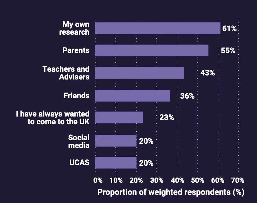 14%的中国家庭在小学阶段就开始考虑送孩子出国留学;47%的家庭从初中阶段开始考虑。总体来看,61%的家庭都在初中或更早就想好要送孩子出国留学了。当然,这些家庭并非都只考虑了英国——多国联申已然成为一股热潮。在UCAS调查到的数据中,63%的中国申请者会同步申请或计划申请其他国家,其中包括:40%申请者考虑美国,39%考虑加拿大,27%考虑澳大利亚。