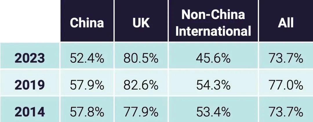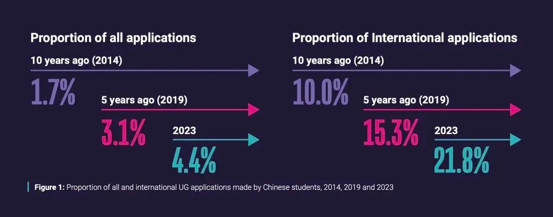 2023年,一共有33,195名中国学生申请英国本科,共有17,405名中国学生拿到Offer,这一数字同样比十年前暴增149%。在2023年,中国学生的录取率有52%,高于非中国国际申请者的46%。在过去的五年里,中国学生申请人数增长了55%,在过去十年中,则是足足增长了175%!