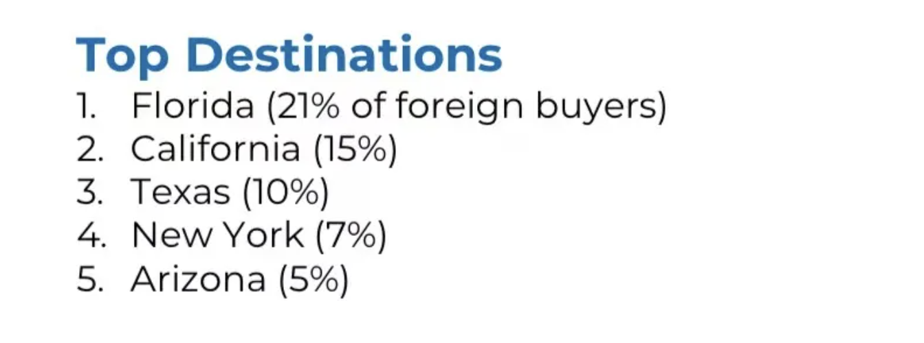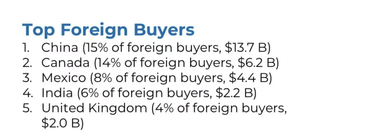 今年国际买家的表现格外亮眼:全美范围内,外国买家购房总额达到560亿美元,其中非美国居民购买了3.44万套房屋,创下自2017年以来首次回升。