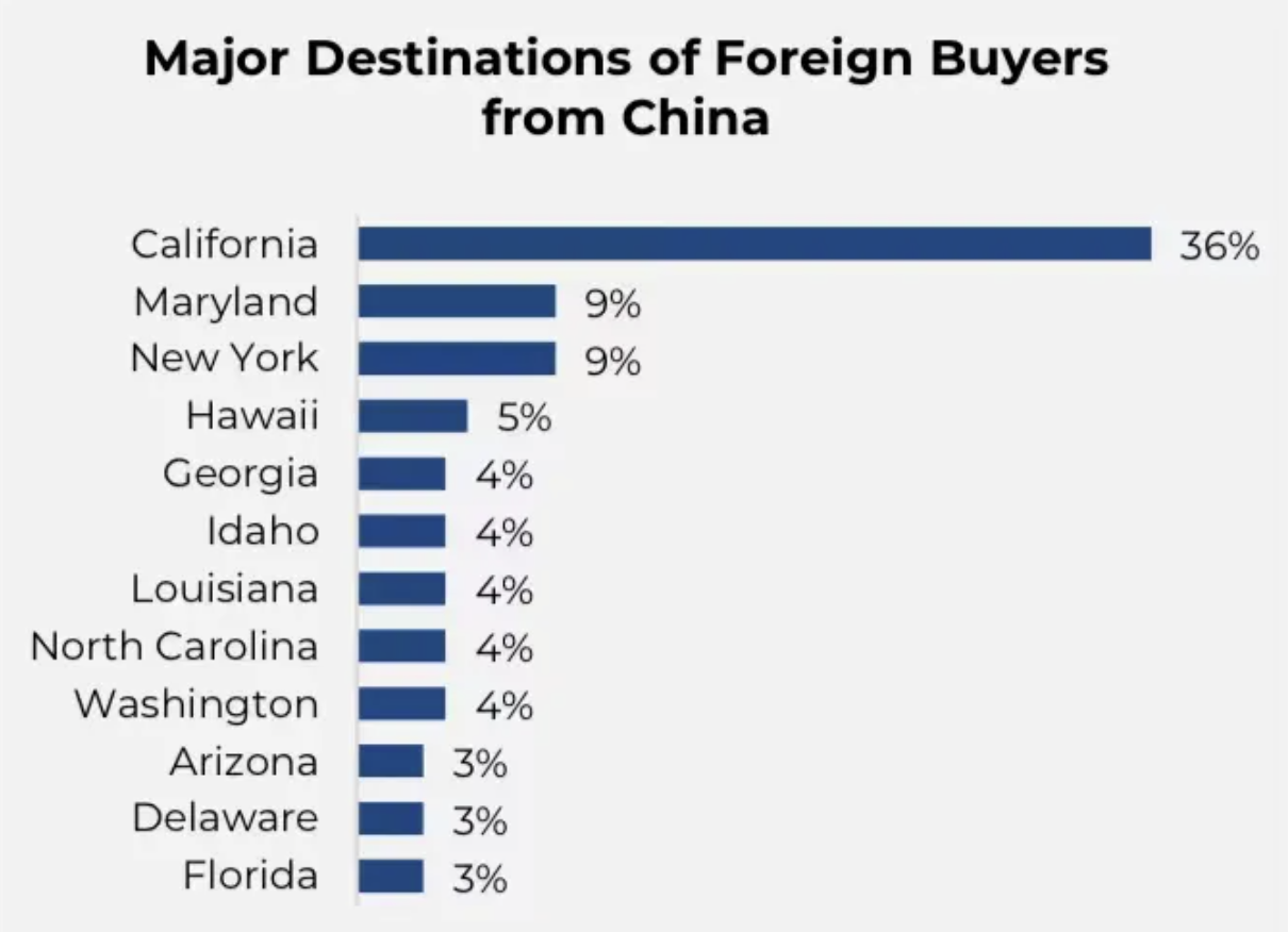 报告还指出,加州是中国买家的首选地(36%),同时也是墨西哥、印度和英国买家的第二大目标。