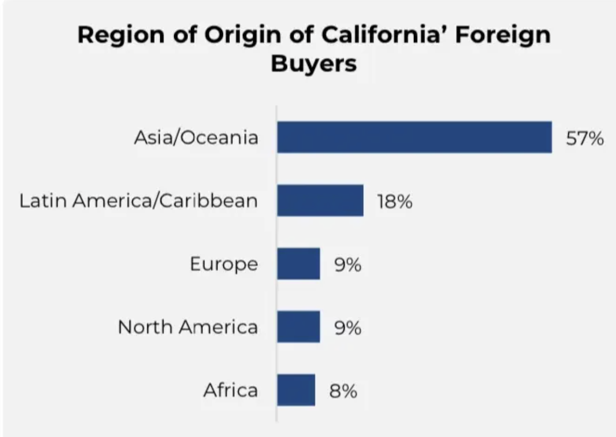 更惊人的是,在加州购房的外国买家中,57%来自亚洲/大洋洲地区,拉丁美洲买家占18%,形成绝对主力。