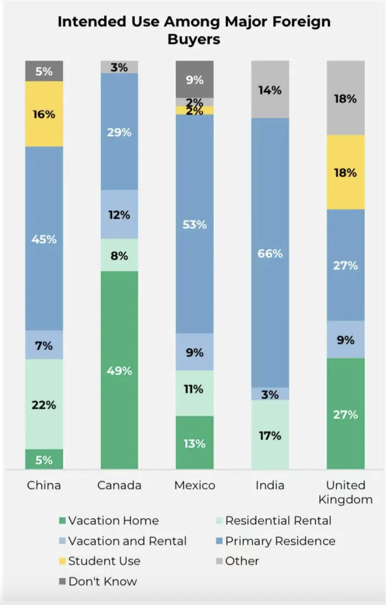 报告显示,60%的海外外国买家购房用于度假或出租,而在美居住的外国买家中仅36%有此目的。